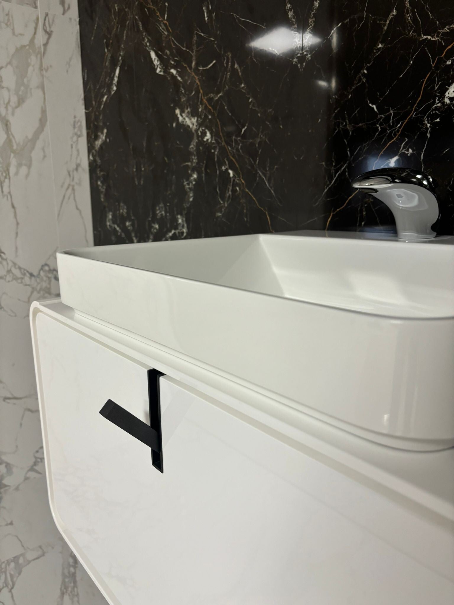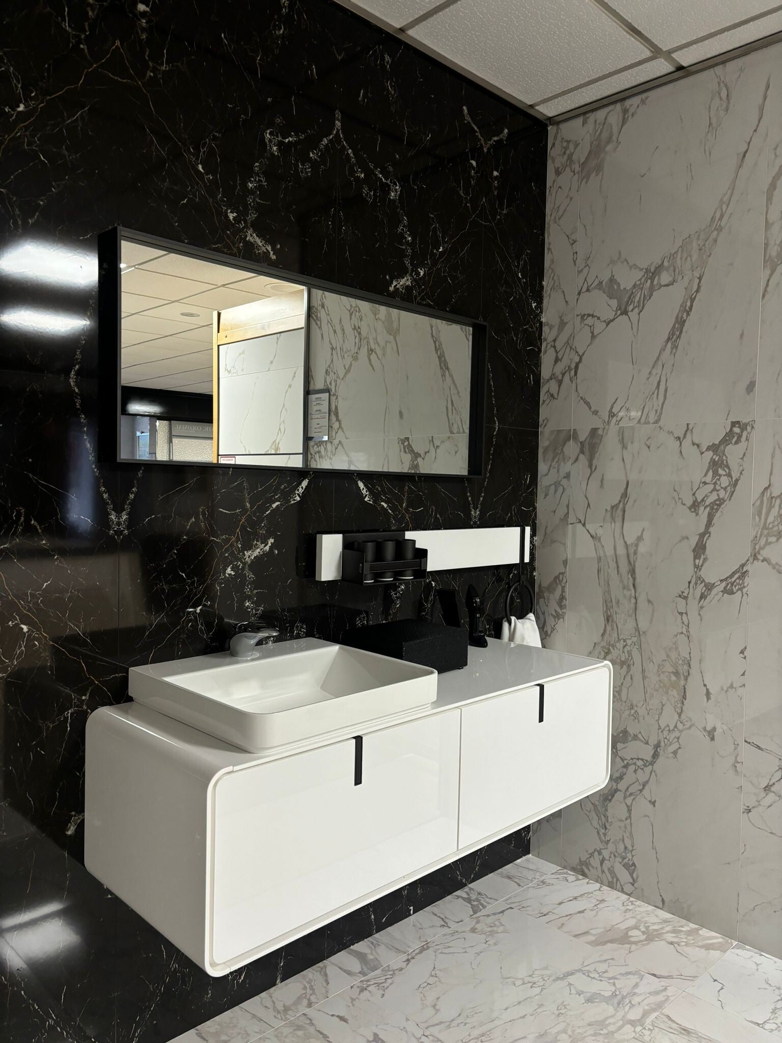 Conjunto de mueble 130 X 48, lavabo, barra porta accesorios, estante y espejo de 120 x 48.